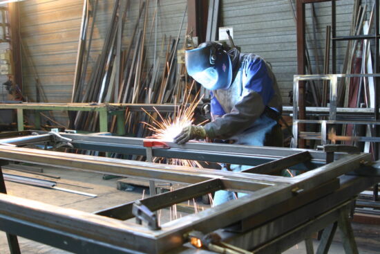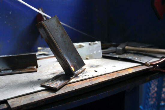 Metal profile after welding. Preparation for grinding metal. Creating a design in the workshop. Making a rack for a garage.